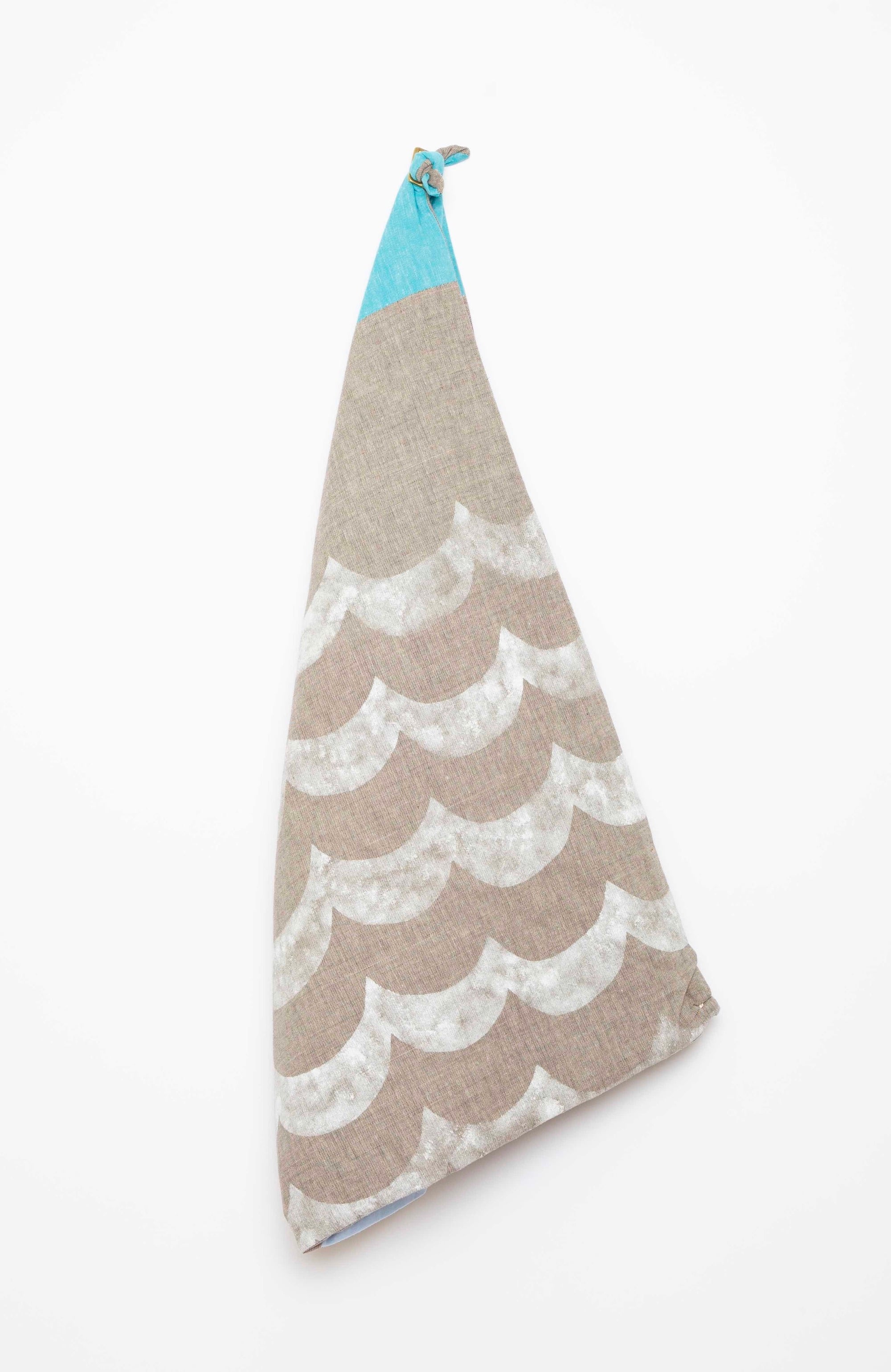 広げた状態の仕上がり【約80cm×80cm】:こちらは「波」を象った型紙を生地に置き、インクを筆でトントンと叩くようにして描きました。筆の質感が風合いのあるグレーのリネンの上にふんわりと描かれています。インクは経年変化により多少は劣化しますが、通常お使いいただく上では問題ありません。